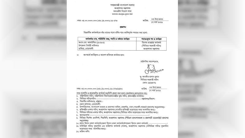 মঙ্গলবার (১৭ মার্চ) বিকালে জনপ্রশাসন মন্ত্রণালয় থেকে প্রজ্ঞাপন জারি করা হয়েছে।