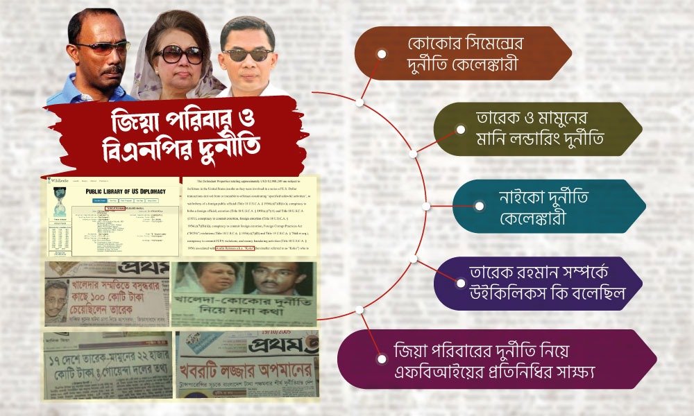 বাংলাদেশের ইতিহাসে সবচেয়ে অন্ধকার অধ্যায় হিসেবে বিবেচনা করা হয় বিএনপি নেতৃত্বাধীন ২০০১-০৬ সাল পর্যন্ত চার দলীয় জোট সরকারের আমলকে। সেই সময় ক্ষমতার শীর্ষে থাকা ব্যক্তিরা দুর্নীতির মাধ্যমে আয় করা টাকার ভাগ নিতেন। তৎকালীন প্রধানমন্ত্রী বেগম খালেদা জিয়া, তার কুলাঙ্গার দুই পুত্র তারেক রহমান ও আরাফাত রহমান কোকো’র দুর্নীতি ও সন্ত্রাসের কারণে বহির্বিশ্বে বাংলাদেশকে খুব বাজেভাবে পরিচিতি পেতে হয়েছিল। দেশে ব্যাপকভাবে দুর্নীতির কারণে টান্সপারেন্সি ইন্টারন্যাশনালের করাপশন পারসেপশন ইনডেক্স (সিপিআই) এ বাংলাদেশে পর পর পাঁচবার দুর্নীতিতে বিশ্বের মধ্যে প্রথম হয়েছিল। বেগম খালেদা জিয়ার শাসন আমল ছিল সর্বগ্রাসী দুর্নীতিতে নিমজ্জিত। দুর্নীতিপরায়ন এই সরকারের শাসনামলে খুব একটা প্রকাশিত না হলেও ২০০৭-০৮ সালের তত্ত্বাবধায়ক সরকারের সময় দুর্নীতিকে বিএনপির প্রাতিষ্ঠানিক রূপ দেওয়া এবং সার্বিক সমর্থন দেওয়ার খবর প্রকাশিত হতে থাকলে খালেদা জিয়া, তার দুই ছেলে ও অন্যান্য শীর্ষ কর্মকর্তার বিরুদ্ধে ব্যবস্থা নেওয়া শুরু হয়। ওই সময়েই তাদের দুর্নীতির জন্য তাদের বিরুদ্ধে মামলা করা হয় যা এখন বিচারাধীন রয়েছে।