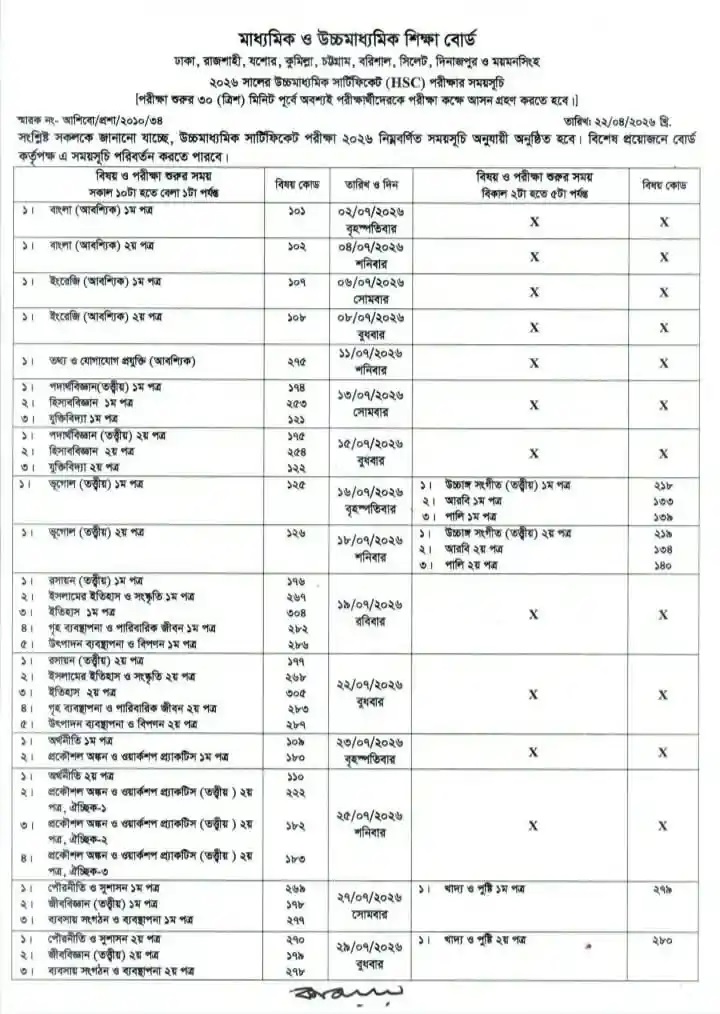 আসন্ন ২০২৬ সালের উচ্চমাধ্যমিক সার্টিফিকেট (এইচএসসি) পরীক্ষার রুটিন প্রকাশ করেছে মাধ্যমিক ও উচ্চ মাধ্যমিক শিক্ষা বোর্ড। আগামী ২ জুলাই থেকে শুরু হয়ে পরীক্ষা শেষ হবে ৮ আগস্ট।