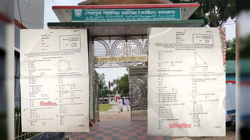বগুড়ার শেরপুর উপজেলায় দাখিল পরীক্ষা ২০২৬-এর গণিত পরীক্ষায় চরম দায়িত্বহীনতার অভিযোগ উঠেছে। নিয়মিত পরীক্ষার্থীদের হাতে অনিয়মিত (ইরেগুলার) সিলেবাসের এমসিকিউ প্রশ্নপত্র তুলে দেওয়ায় ২৯ জন শিক্ষার্থীর ফলাফল এখন অনিশ্চয়তার মুখে। গত রোববার (২৬ এপ্রিল) শেরপুর শহীদিয়া আলিয়া মাদ্রাসা কেন্দ্রের ১০১ ও ১০২ নম্বর কক্ষে এই নজিরবিহীন ঘটনা ঘটে।