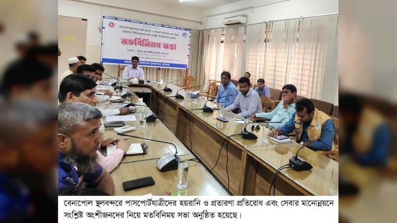 বেনাপোল স্থলবন্দরে পাসপোর্টযাত্রীদের হয়রানি ও প্রতারণা প্রতিরোধ এবং সেবার মানোন্নয়নে সংশ্লিষ্ট অংশীজনদের নিয়ে মতবিনিময় সভা অনুষ্ঠিত হয়েছে। মঙ্গলবার (২৮ এপ্রিল) দুপুরে আন্তর্জাতিক প্যাসেঞ্জার টার্মিনাল ভবনের সম্মেলন কক্ষে এ সভা অনুষ্ঠিত হয়।