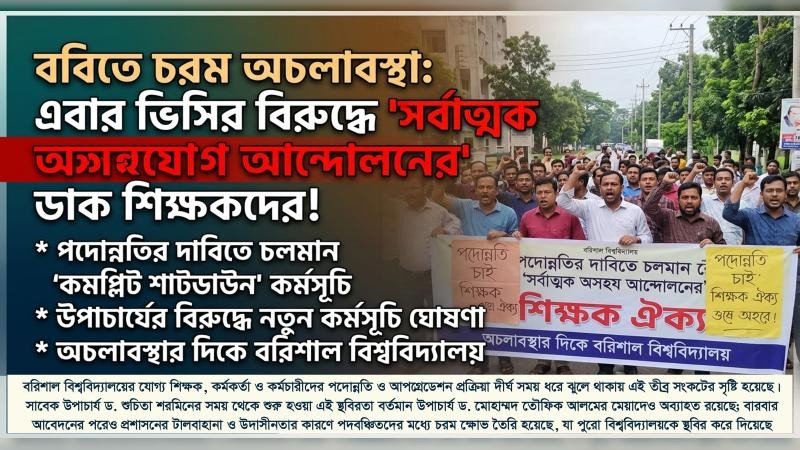 পদোন্নতির দাবিতে বরিশাল বিশ্ববিদ্যালয়ে শিক্ষকদের চলমান ‘ কমপ্লিট শাটডাউন’ কর্মসূচির পর এবার উপাচার্যের বিরুদ্ধে ‘সর্বাত্মক অসহযোগ আন্দোলনের’ ঘোষণা দিয়েছেন বরিশাল বিশ্ববিদ্যালয়ের আন্দোলনরত শিক্ষকরা।