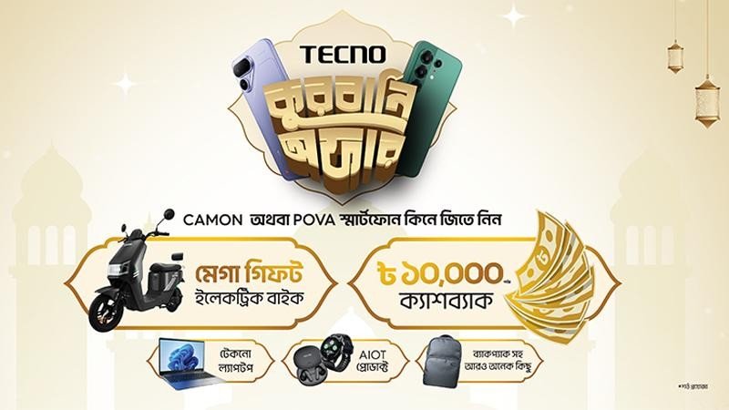 ঈদ-উল-আযহা উপলক্ষে একটি বিশেষ ক্যাম্পেইন চালু করেছে টেকনো। এই ক্যাম্পেইনে ক্যামন সিরিজ বা পোভা সিরিজের যেকোনো স্মার্টফোন কিনলেই গ্রাহকরা ল্যাপটপ ও ইলেকট্রিক বাইকের মতো আকর্ষণীয় মেগা উপহার জেতার সুযোগ পাচ্ছেন। ১ মে থেকে শুরু হওয়া এই ক্যাম্পেইন চলবে ঈদ পর্যন্ত।