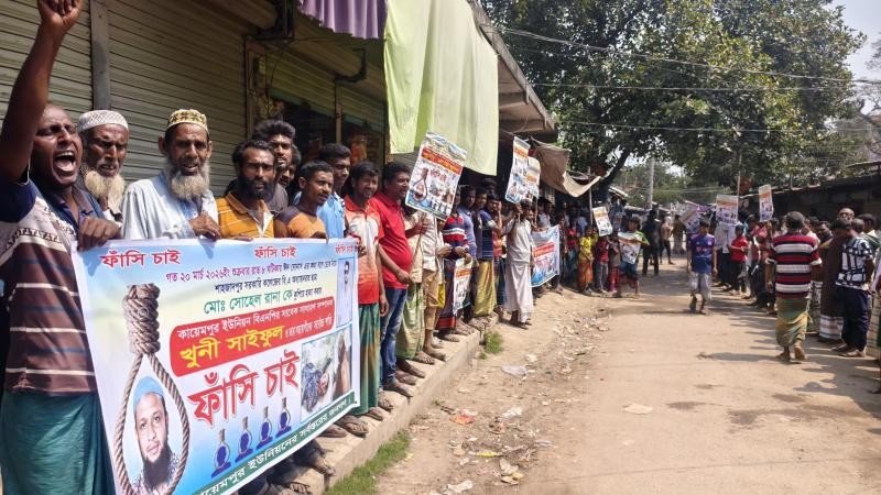 শুক্রবার (২৭মার্চ) উপজেলার কায়েমপুর ইউনিয়নের সড়াতৈল গ্রামে সর্বস্তরের জনসাধারণের আয়োজনে বিক্ষোভ মিছিল ও মানববন্ধন অনুষ্ঠিত হয় । এ মানববন্ধনে নিহতের মা রুবি খাতুন, চাচাতো ভাই মনির হোসেন, সাবেক ইউপি সদস্য আব্দুল আলীম বাঘা, মোমিন হোসেন, সহিদুল ইসলাম প্রমুখ বক্তব্য রাখেন।