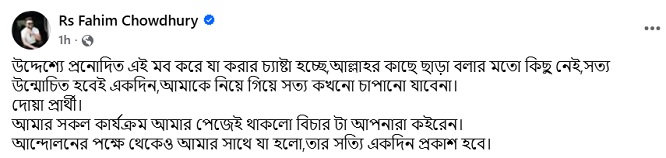 ফাহিম দাবি করেন, তিনি আন্দোলনের পক্ষে থাকলেও তার সঙ্গে যা ঘটেছে, তার প্রকৃত সত্য একদিন সামনে আসবে।