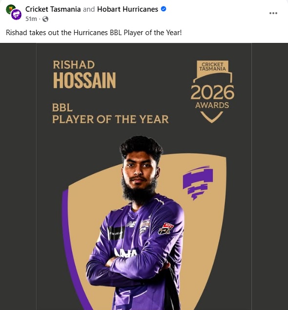 বুধবার (১ এপ্রিল) হোবার্ট হারিকেন্স তাদের সামাজিক মাধ্যমে বিষয়টি নিশ্চিত করেছে। তাসমানিয়ার বার্ষিক পুরস্কার বিতরণী উপলক্ষে ঘোষিত এই সম্মান রিশাদের ক্যারিয়ারে বড় এক মাইলফলক।
