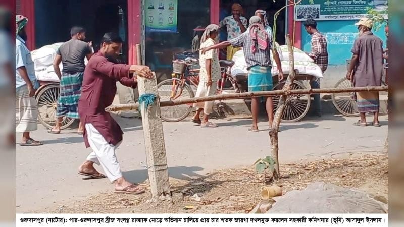 নাটোরের গুরুদাসপুরে দখলমুক্ত করা হলো পার-গুরুদাসপুর ব্রীজ সংলগ্ন রাজ্জাক মোড়ের প্রায় চার শতক জায়গা। বৃহস্পতিবার দুপুর ২টার দিকে সহকারী কমিশনার (ভূমি) আসাদুল ইসলাম উপস্থিত থেকে তিনরাস্তার ওই মোড়ের দুইপাশে অবৈধভাবে দখলকৃত জায়গা উদ্ধার করেন।