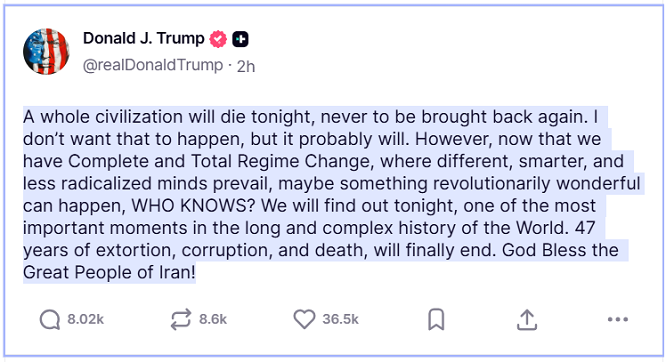 বাংলাদেশ সময় মঙ্গলবার সন্ধ্যার পর ট্রুথ সোস্যাল অ্যাকাউন্টে দেওয়া ওই বার্তায় ট্রাম্প ইঙ্গিতপূর্ণ ভাষায় লিখেছেন, “একটি পুরো সভ্যতা আজ রাতেই ধ্বংস হয়ে যাবে, আর কখনোই ফিরে আসবে না। আমি এটা চাই না, কিন্তু সম্ভবত তাই-ই ঘটবে। তবে এখন যেহেতু সম্পূর্ণ ও চূড়ান্ত শাসন পরিবর্তন (রেজিম চেঞ্জ) হয়েছে, যেখানে ভিন্ন, আরও বুদ্ধিমান এবং কম চরমপন্থী মনোভাবের মানুষ প্রাধান্য পাচ্ছে, হয়তো বিপ্লবাত্মকভাবে চমৎকার কিছু ঘটতে পারে—কে জানে? আমরা তা আজ রাতেই জানতে পারব, যা বিশ্বের দীর্ঘ ও জটিল ইতিহাসের সবচেয়ে গুরুত্বপূর্ণ মুহূর্তগুলোর একটি। ৪৭ বছরের চাঁদাবাজি, দুর্নীতি এবং মৃত্যুর অবসান অবশেষে ঘটবে। মহান ইরানের জনগণকে ঈশ্বর আশীর্বাদ করুন!” মাধ্যমে নতুন ও কম চরমপন্থী নেতৃত্বের উত্থান ঘটতে পারে।