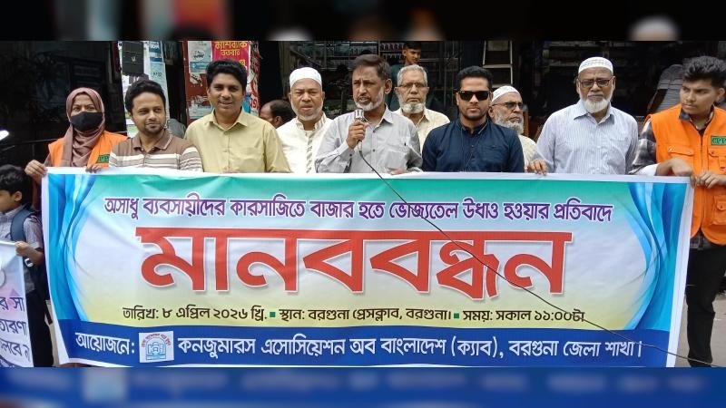 কনজ্যুমারস এসোসিয়েশন অফ বাংলাদেশ (ক্যাব) বরগুনা জেলা কমিটির উদ্যোগে বুধবার (৮ এপ্রিল) বেলা ১১ টায় বরগুনা প্রেস ক্লাব চত্বরে মানববন্ধন অনুষ্ঠিত হয়েছে।