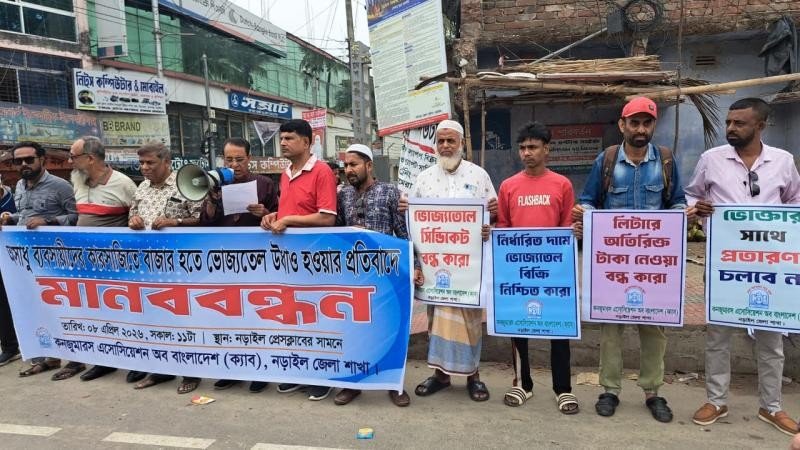 অসাধু ব্যবসায়ীদের কারসাজিতে বাজার থেকে ভোজ্যতেল উধাও হয়ে কৃত্রিম সংকট সৃষ্টির প্রতিবাদে নড়াইলে মানববন্ধন কর্মসূচি পালিত হয়েছে।