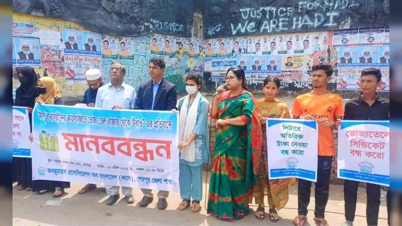 বাজারে ভোজ্য তেলের কৃত্রিম সংকট সৃষ্টি করে সাধারণ ভোক্তাদের ভোগান্তিতে ফেলার অভিযোগে শেরপুরে প্রতিবাদী মানববন্ধন কর্মসূচি পালন করেছে ভোক্তা অধিকার সংগঠন কনজ্যুমার অ্যাসোসিয়েশন অব বাংলাদেশ (ক্যাব)।