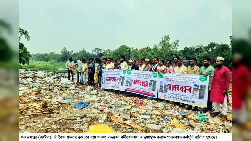 নাটোরের গুরুদাসপুরে চাঁচকৈড় শহরের বুকচিরে বয়ে যাওয়া নন্দকুজা নদীকে দখল-দুষণমুক্ত করার দাবিতে মানববন্ধন ও প্রতিবাদ সভা অনুষ্ঠিত হয়েছে| শুক্রবার সকাল ১০টায় পৌর সদরের চাঁচকৈড় নতুন গো-হাটা সংলগ্ন নন্দকুজা নদীতে ফেলা ময়লা আবর্জনার ওপর দাঁড়িয়ে থেকে ওই মানববন্ধন করেন পরিবেশ কর্মী ও এলাকাবাসী।
