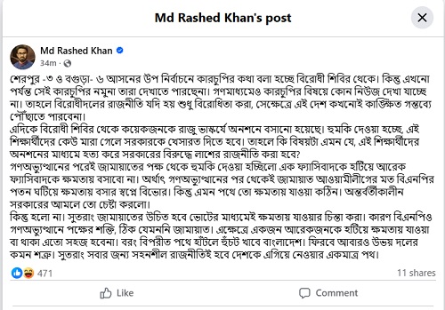 পোস্টে রাশেদ খাঁন বলেন, শেরপুর-৩ ও বগুড়া-৬ আসনের উপনির্বাচনে কারচুপির অভিযোগ তুলছে বিরোধী শিবির। তবে এখন পর্যন্ত তারা এ ধরনের কোনো নির্দিষ্ট প্রমাণ দেখাতে পারেনি। এমনকি গণমাধ্যমেও কারচুপির বিষয়ে তেমন কোনো প্রতিবেদন প্রকাশিত হয়নি বলে তিনি উল্লেখ করেন। তার ভাষায়, শুধুমাত্র বিরোধিতার রাজনীতি করলে দেশ কখনোই কাঙ্ক্ষিত লক্ষ্যে পৌঁছাতে পারবে না।