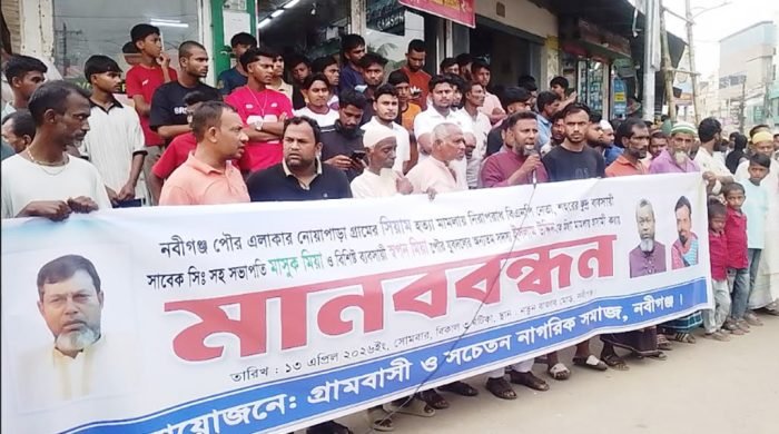 হবিগঞ্জের নবীগঞ্জ উপজেলায় সিয়াম আহমদ হত্যাকাণ্ডের প্রকৃত অপরাধীদের দৃষ্টান্তমূলক শাস্তি এবং মামলায় জড়ানো নিরপরাধ ব্যক্তিদের অব্যাহতির দাবিতে বিশাল মানববন্ধন অনুষ্ঠিত হয়েছে।