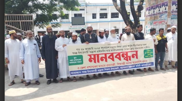ঝালকাঠিতে ইবতেদায়ী মাদ্রাসা শিক্ষকদের মানববন্ধন ও স্মারকলিপি প্রদান