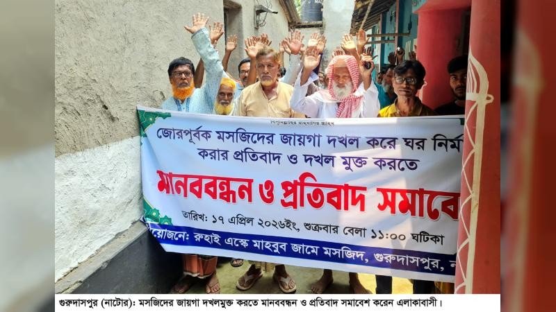 নাটোরের গুরুদাসপুরে মসজিদের জায়গা, সরকারি রাস্তা ও বসতবাড়ির জায়গা জবরদখলের অভিযোগ উঠেছে আইনজীবী আব্দুল মোতালেব আনাম ও তার মেয়ে শিউরী খাতুনের বিরুদ্ধে। শুক্রবার বেলা ১১টায় উপজেলার রুহাই গ্রামের চকপাড়ায় এস্কে মাহাবুব জামে মসজিদের সামনে অনুষ্ঠিত মানববন্ধনে ওই অভিযোগ করেন এলাকাবাসী। অবৈধ দখলের কারণে মসজিদের সামনের সরু রাস্তায় ঠাসাঠাসি ভাবেই মানববন্ধন করেন তারা।
