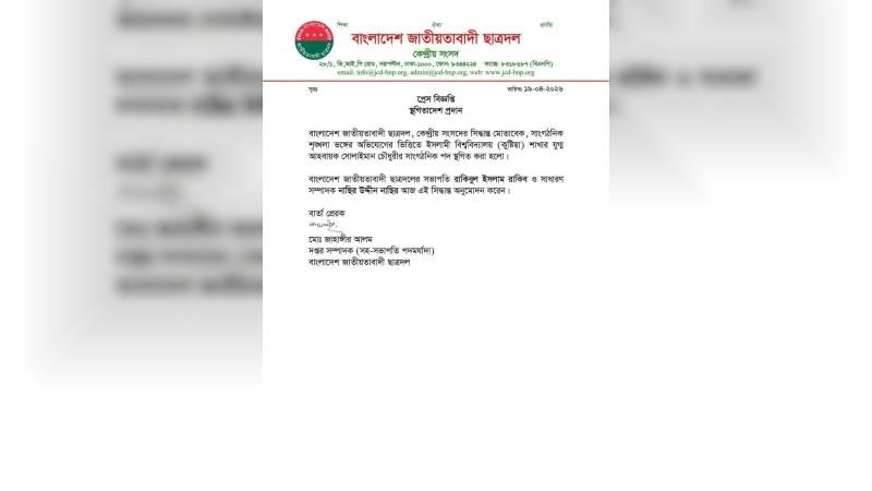 বিজ্ঞপ্তিতে বলা হয়, কেন্দ্রীয় সংসদের সিদ্ধান্ত অনুযায়ী সাংগঠনিক শৃঙ্খলা ভঙ্গের অভিযোগের ভিত্তিতে ইবি শাখার যুগ্ম আহ্বায়ক সোলাইমান চৌধুরীর সাংগঠনিক পদ স্থগিত করা হলো। ছাত্রদলের সভাপতি রাকিবুল ইসলাম রাকিব ও সাধারণ সম্পাদক নাছির উদ্দীন নাছির এই সিদ্ধান্ত অনুমোদন করেন।