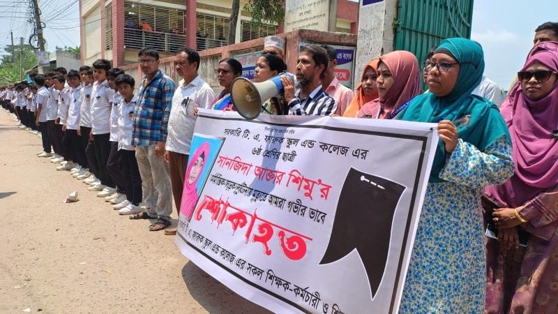 মানববন্ধনে উপস্থিত ছিলেন- প্রভাষক সাহাদাৎ হোসেন, সহকারী শিক্ষক অপরুপ হালদার, রেবতী হালদার, ফজিলাতুন্নেছা বকুল, সরদার মেহফুজ আজিজ টুলু, বিলতা হালদার প্রমুখ।