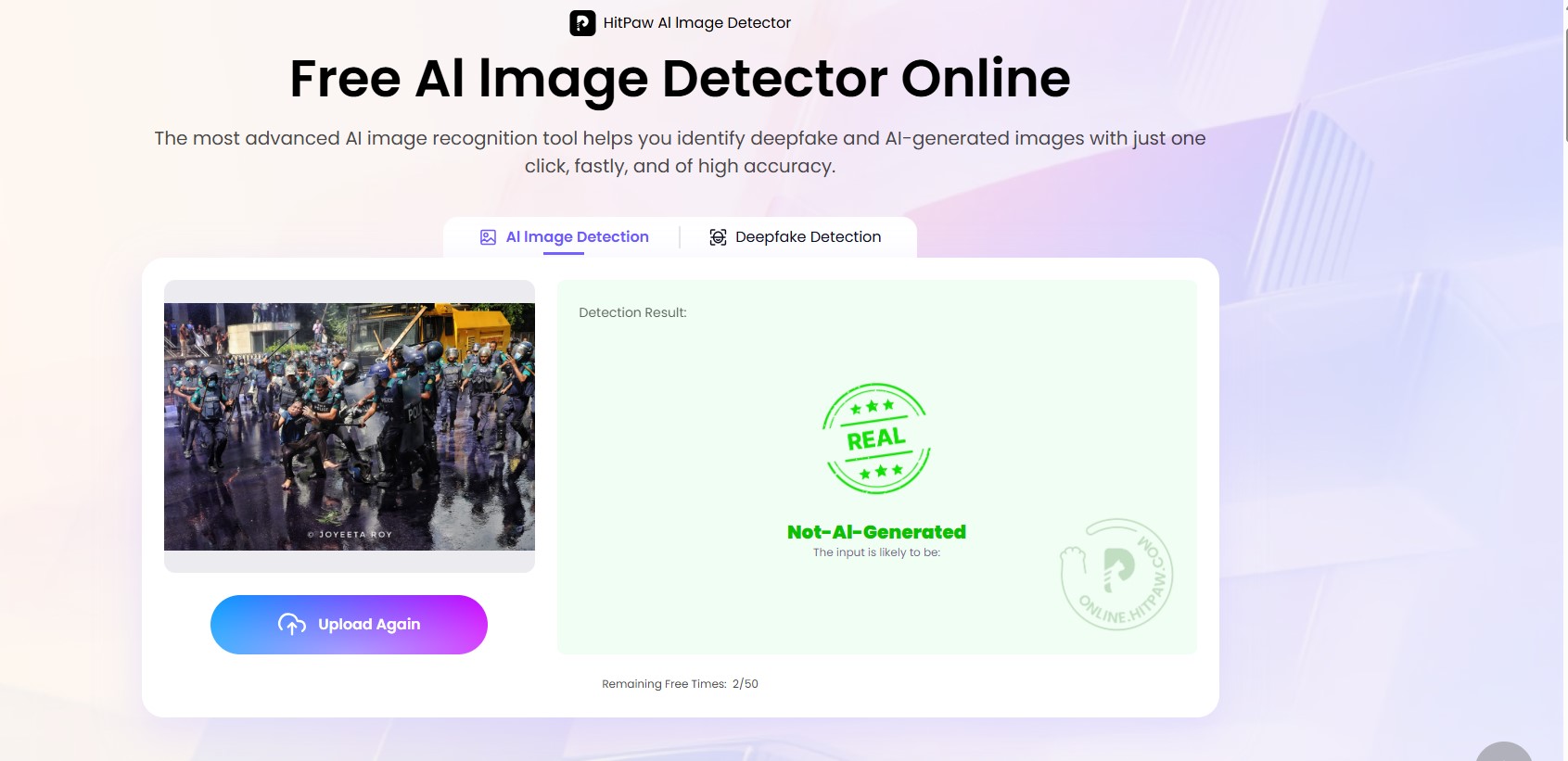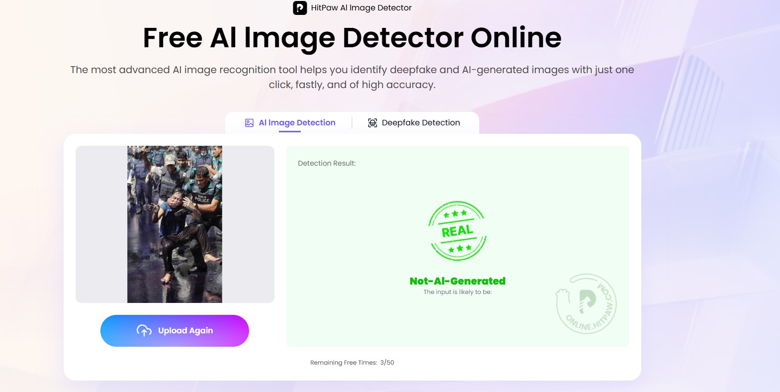 জয়ীতা রয়ের তোলা ছবিটি অনলাইন ডট হিটপ ডটকমে সার্চ দিয়ে দেখা যায়, শিক্ষার্থীর মুখ চেপে ধরা ছবিটি এআই জেনারেটেড নয়। আর মূল ছবিটি ক্রপ (কেটে) করে ডিএমপির প্রকাশ করা ছবিটিও সার্চ করে দেখা যায়, এটি এআই জেনারেটেড নয়।