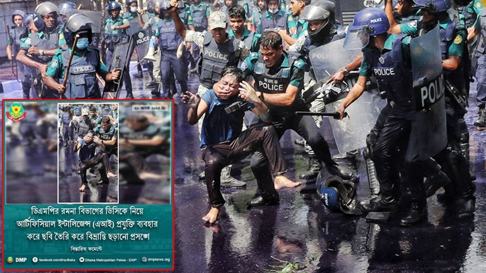 এদিকে আজ বৃহস্পতিবার ঢাকা মেট্রোপলিটন পুলিশের (ডিএমপি) ফেসবুক পেজে পুলিশি আক্রমণের একটি ছবি শেয়ার করে দাবি করা হয়েছে- শিক্ষার্থীর মুখ চেপে ধরা যে ছবিটি সোশ্যাল মিডিয়ায় ছড়িয়ে পড়েছে, সেটি আর্টিফিসিয়াল ইন্টালিজেন্স (এআই) প্রযুক্তি ব্যবহার করে তৈরি। একই দাবি করে ডিএমপি নিউজও একটি প্রতিবেদন প্রকাশ করেছে। ডিএমপি সংবাদ বিজ্ঞপ্তিতে দাবি করেছে, ‘সম্প্রতি ঢাকা মেট্রোপলিটন পুলিশের রমনা বিভাগের উপ-পুলিশ কমিশনার মো. মাসুদ আলমকে নিয়ে আর্টিফিশিয়াল ইন্টেলিজেন্স (এআই) প্রযুক্তি ব্যবহার করে তৈরি এক ছাত্রের মুখ চেপে ধরার একটি ছবি বিভিন্ন গণমাধ্যম ও সামাজিক যোগাযোগমাধ্যমে প্রকাশিত হয়েছে; যা ঢাকা মেট্রোপলিটন পুলিশের দৃষ্টিগোচর হয়েছে’।