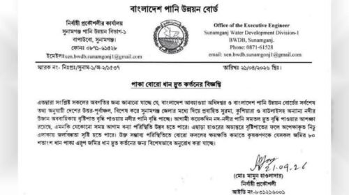 পাকা বোরো ধান দ্রুত কর্তনের জন্য আহবান জানিয়েছেন সুনামগঞ্জ পানি উন্নয়ন বোর্ড(পাউবো) নির্বাহী প্রকৌশলী মামুন হাওলাদার। মঙ্গলবার বিকেলে এক বিজ্ঞপ্তিতের…